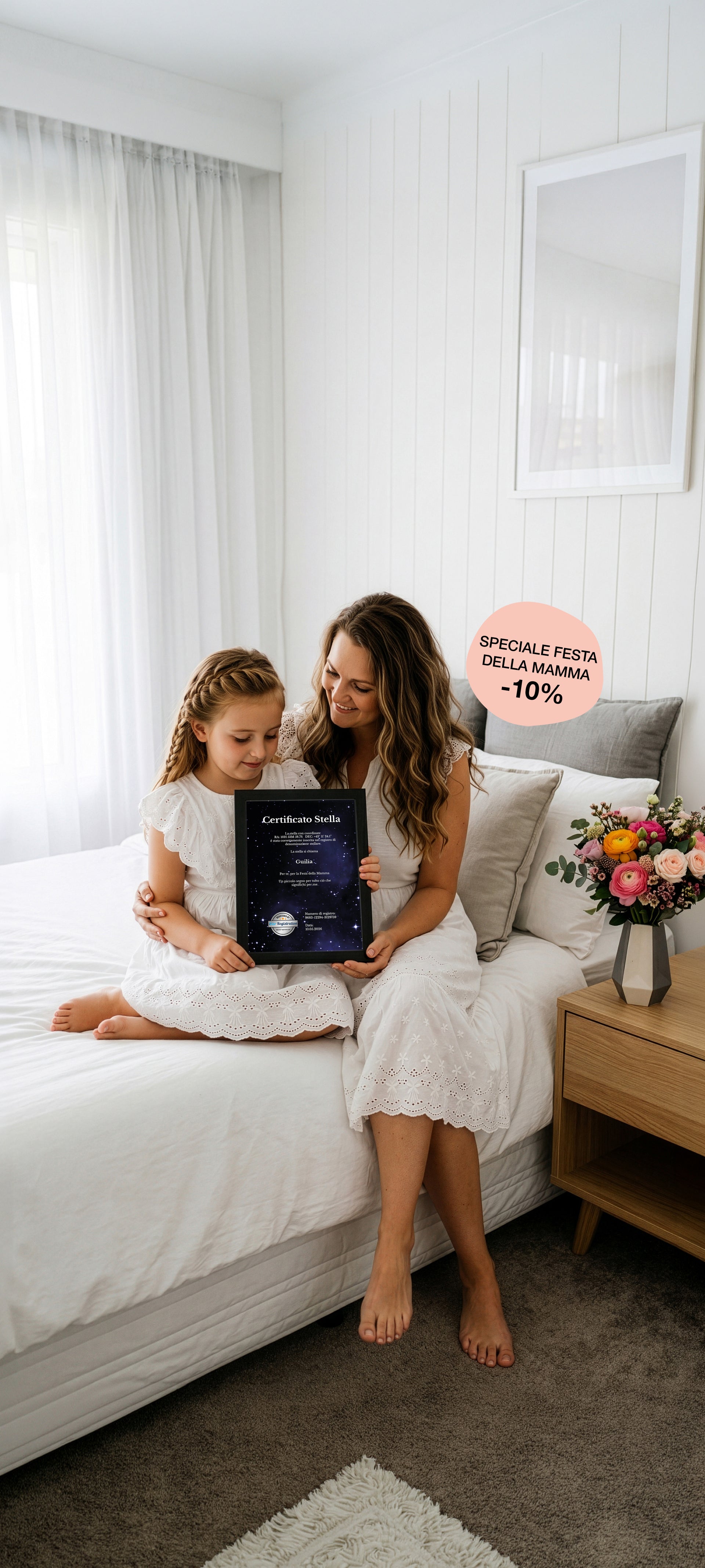 Rendi indimenticabile ogni celebrazione con un certificato di registrazione stellare personalizzato. Questo documento unico non solo segna il battesimo della tua stella nel cielo notturno, ma funge anche da splendido ricordo da custodire negli anni a venire. Ogni certificato è personalizzato per includere il nome della stella, le sue coordinate celesti e la data di registrazione, e permette al cliente di scegliere il proprio design, rendendolo un regalo davvero personale.